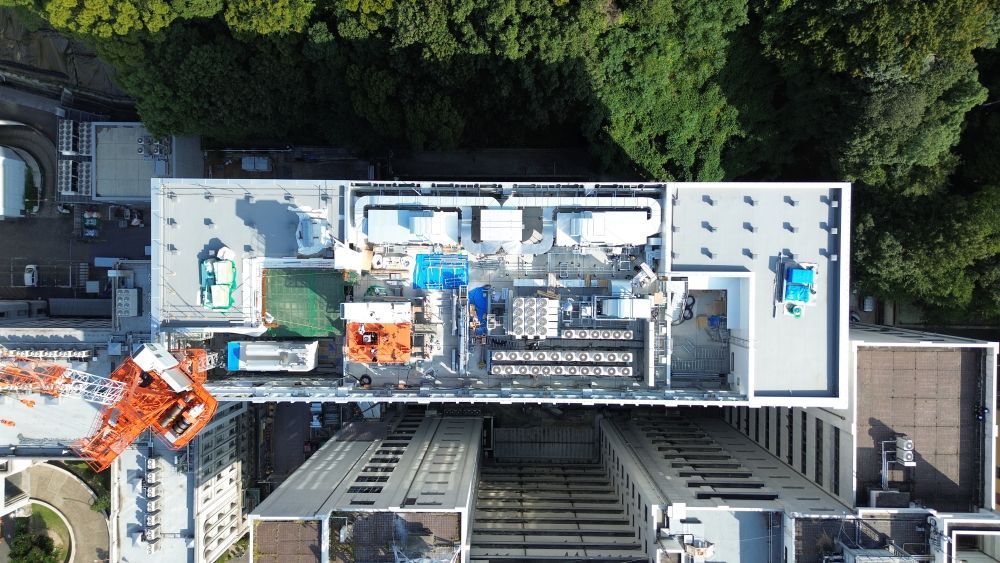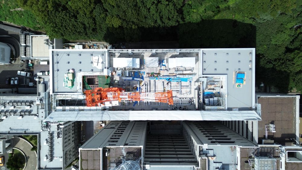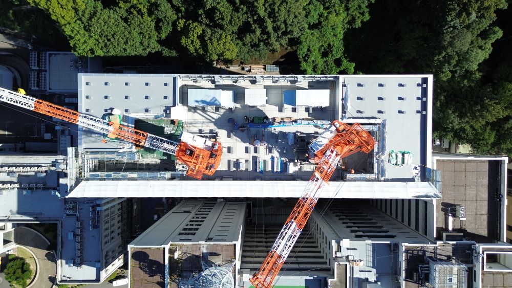東から順に行うクレーン解体計画にそって、屋上に設備機器を設置する計画を行いました。工事も計画通りに進捗し、タワークレーン計画のすべてが終了しました!