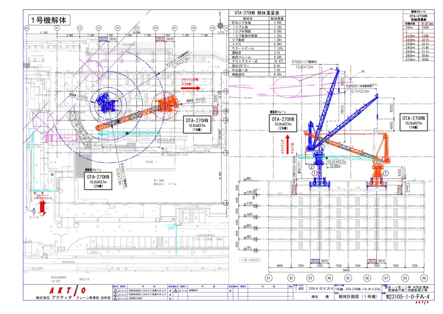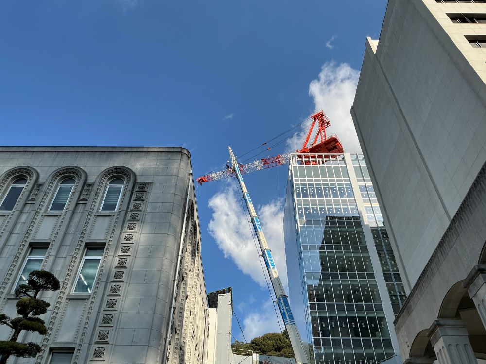愛媛県庁第二別館のタワークレーン計画は、鉄骨建方と並行したフロアークライミング計画、屋上設備機器設置を見据えた屋上へのフロアークライミング計画、2号機解体の為の解体用3号機クレーン設置計画と盛りだくさんの検討が必要でした。
