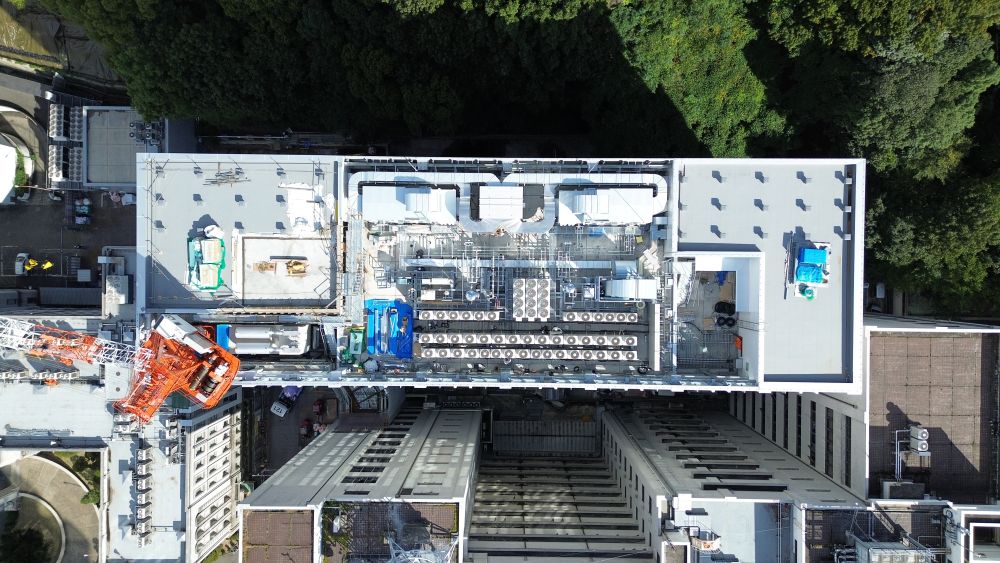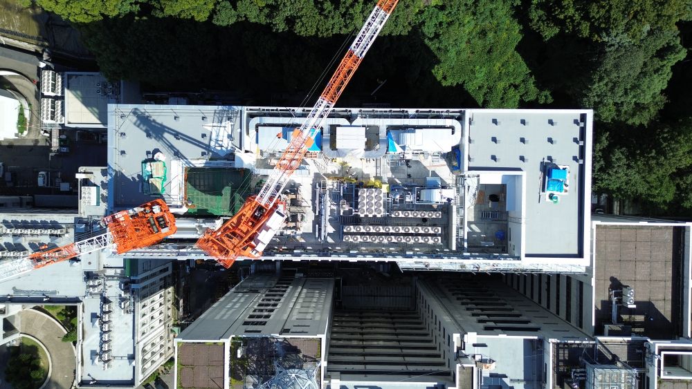 1号機を解体したことで、空いたスペースに空冷チラー,室外機等の設備機器設置や、電気設備工事を行い、工事途中に設置したタワークレーン3号機で解体を行いました。