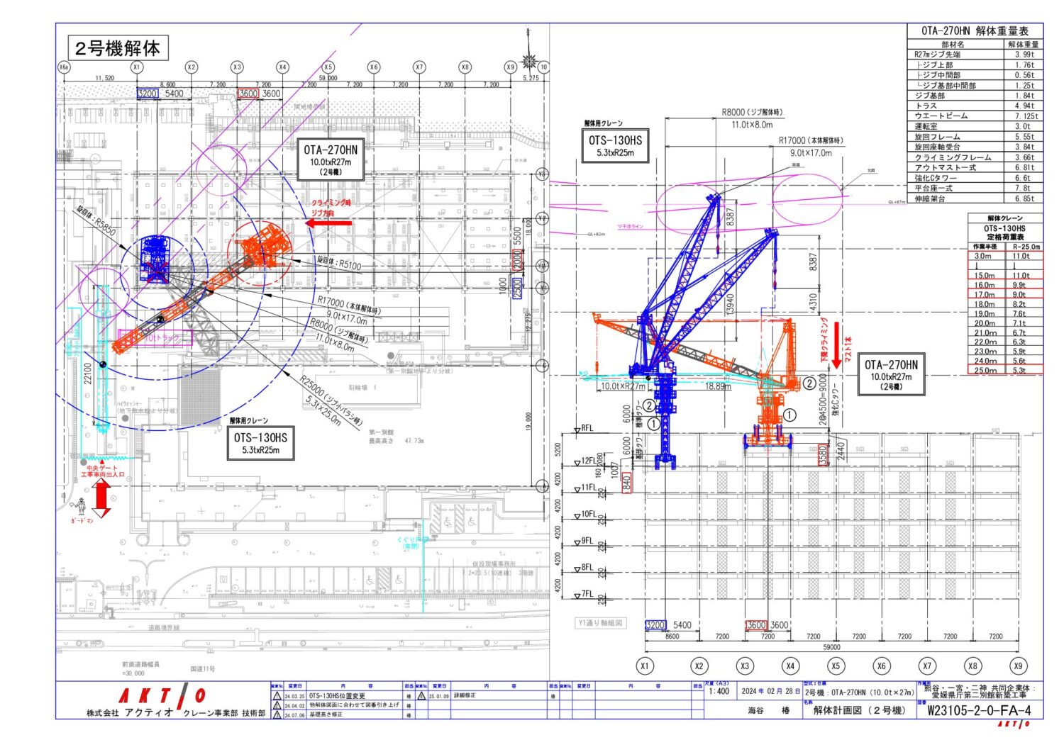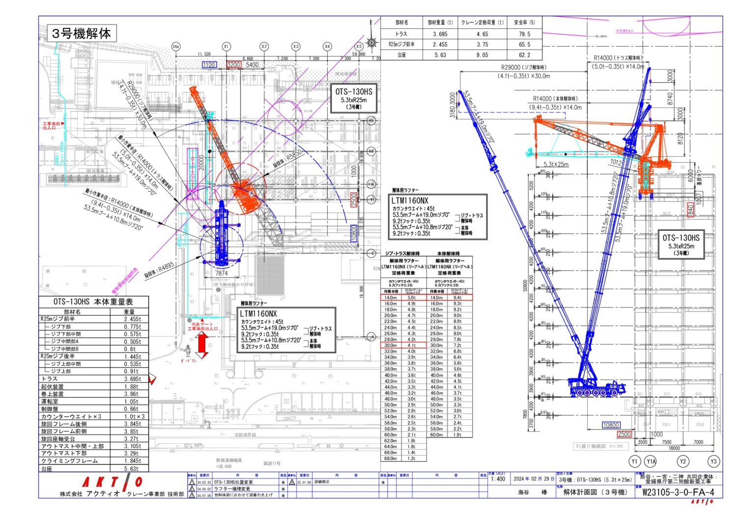 2号機を解体したことで、上空マイクロ波の都合で施工出来なかった躯体ダメ部分の工事を行い、地上に設置した移動式160tクレーンで解体を行いました。