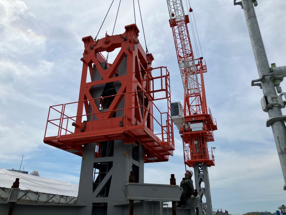その次にA-フレームを吊った状態でボルトを外しクレーンより切り離します。