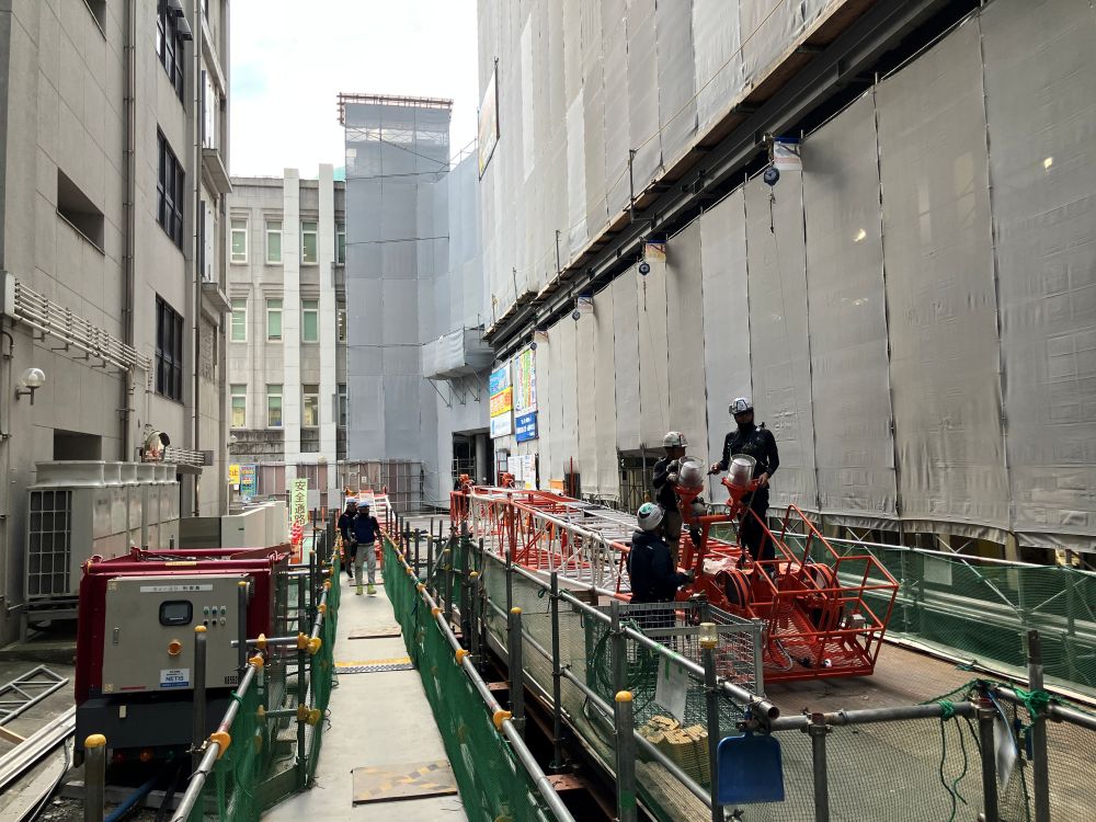 当現場は①二人三脚で行う親亀子亀孫亀方式で、親亀にあたるタワークレーン2号機を解体します。